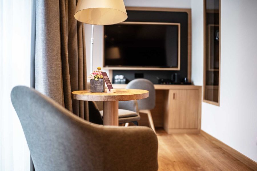 Unsere Zimmer sind mit hochwertigen Materialien und einem echtholzbelegten Boden ausgestattet. Die warme Ausstrahlung des Eichenholzes verleiht den Räumen eine gemütliche Atmosphäre. Das Design ist lichtdurchflutet und lässt die natürliche Schönheit der Umgebung auch im Inneren erlebbar werden.