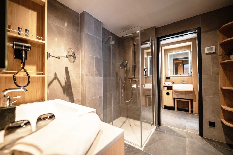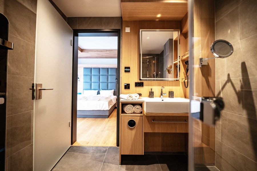 Eins unserer Familienzimmer ist für bis zu vier Personen ausgelegt und bietet ausreichend Platz für Komfort und Privatsphäre. Durch zwei separate Zugänge können die Räume unabhängig voneinander betreten werden, sodass sich niemand gestört fühlt. Das Badezimmer ist ebenfalls von beiden Bereichen aus zugänglich. Hier können Sie Ihren Aufenthalt in vollen Zügen genießen und sich wie zu Hause fühlen.